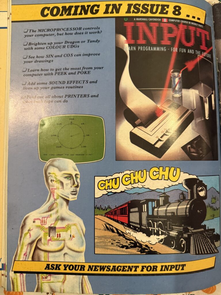 A photograph of the back cover of issue 7 of Input magazine, showing that PEEK and POKE are coming in issue 8.